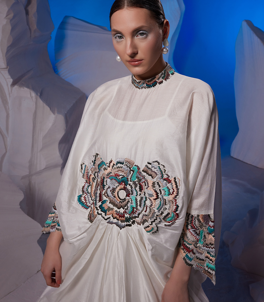 Cowl Dress Adorned With Vibrant Embroidery