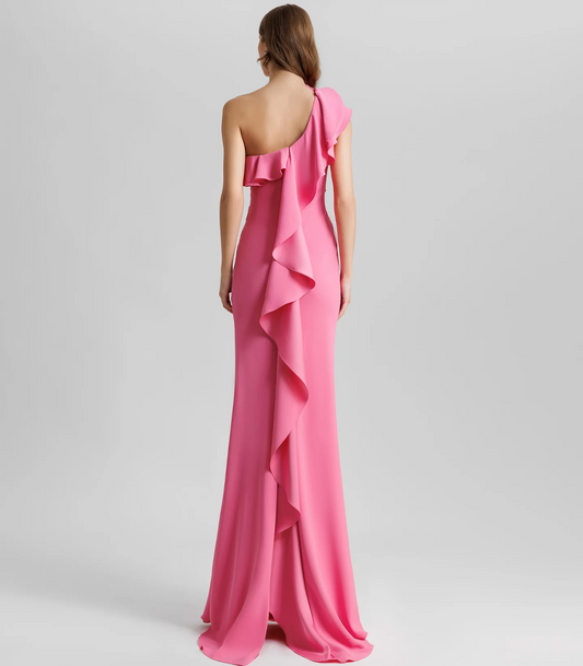One-Shoulder Ruffled Neckline Candy Pink Dress