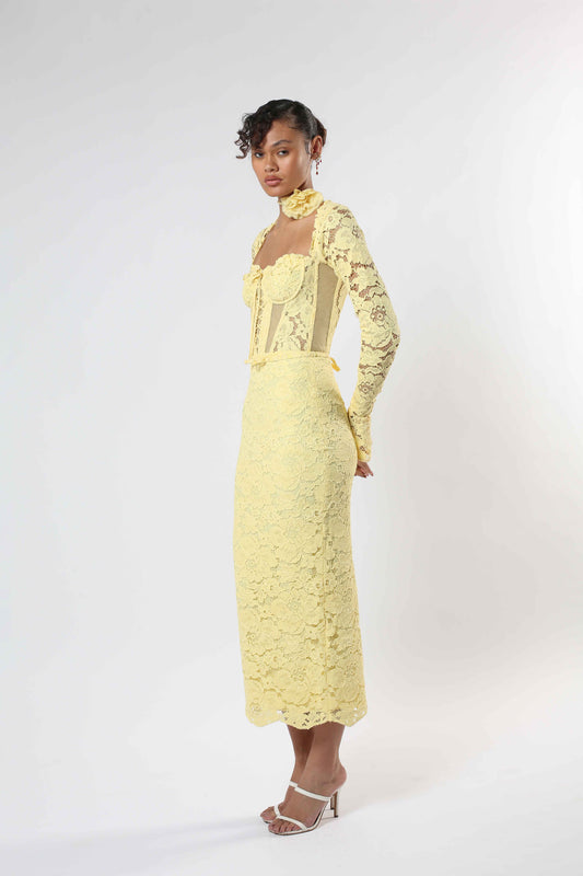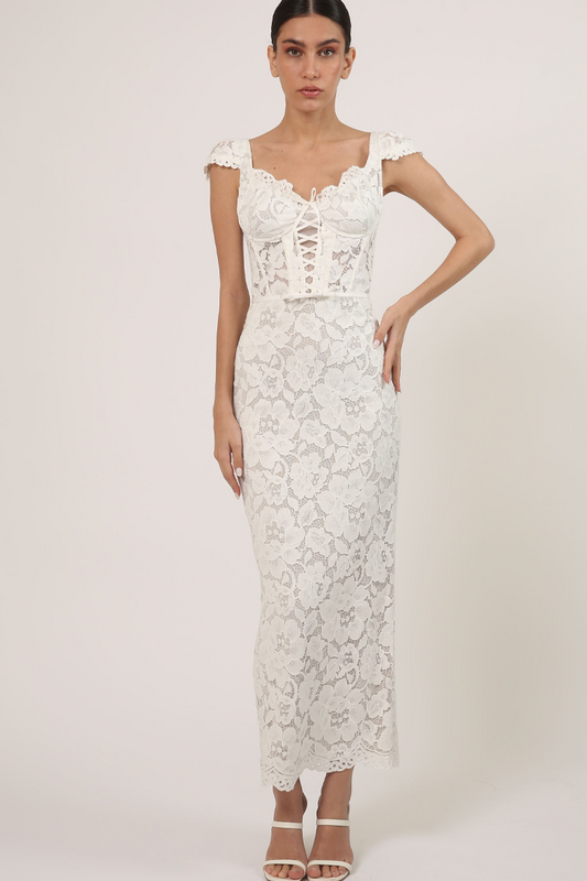 WHITE SWEATHEART NECKLINE DANTELLE MIDI DRESS