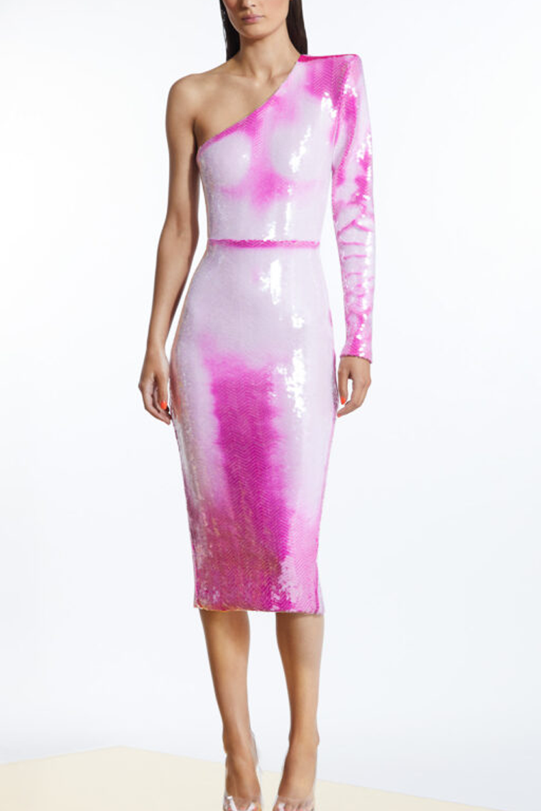 A PATENT PENDING CHAMELEON “MOOD” SEQUIN, ONE-SHOULDER MIDI LENGTH DRESS. THIS INNOVATIVE PATENT PENDING EMBELLISHED FABRIC IS DESIGNED TO CHANGE COLOUR BASED ON THE TEMPERATURE OF YOUR BODY AND THE AIR AROUND YOU. THIS MEANS THAT THE GARMENT WILL BE DIFFERENT EVERY TIME YOU WEAR IT & WILL TRANSITION DIFFERENTLY IN EACH SEASON. SUCH AN INNOVATIVE GARMENT HAS IMPORTANT CARE INSTRUCTIONS, YOU SHOULD TAKE CARE WHEN SITTING ON ANY ROUGH SURFACES, OR WHEN WEARING BAGS WITH CHAIN STRAPS AS THIS CAN CATCH AND PULL OFF THE SEQUINS Model: ZV-1179 Material: Polyester Cleaning: Dry Clean/Gentle Hand Wash Check out other items available