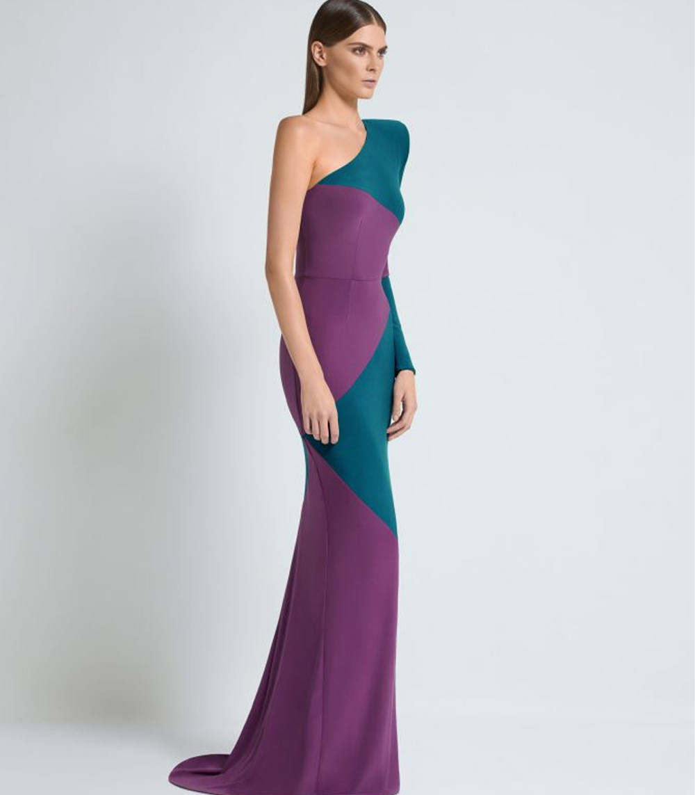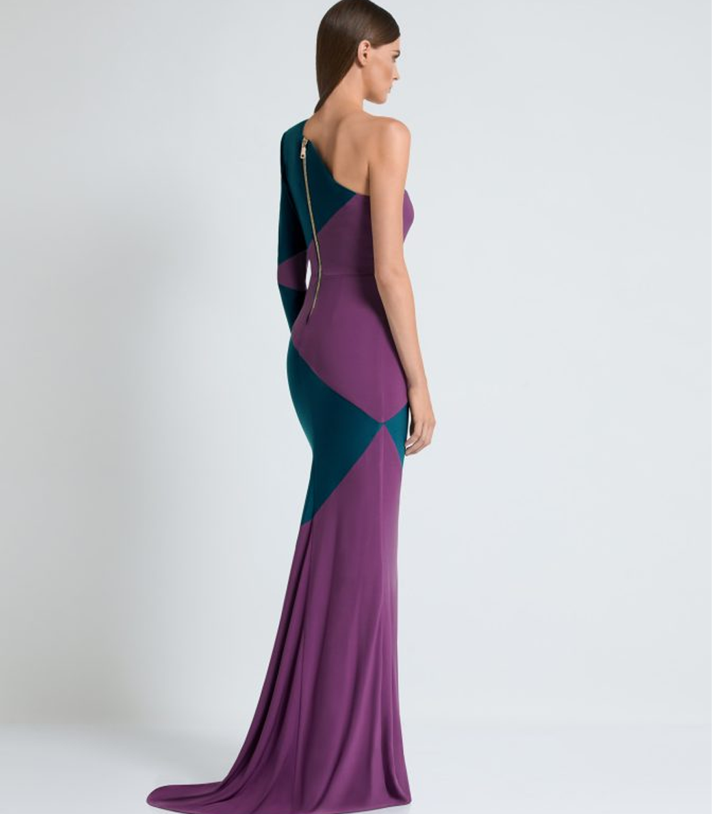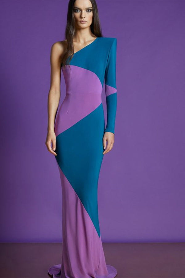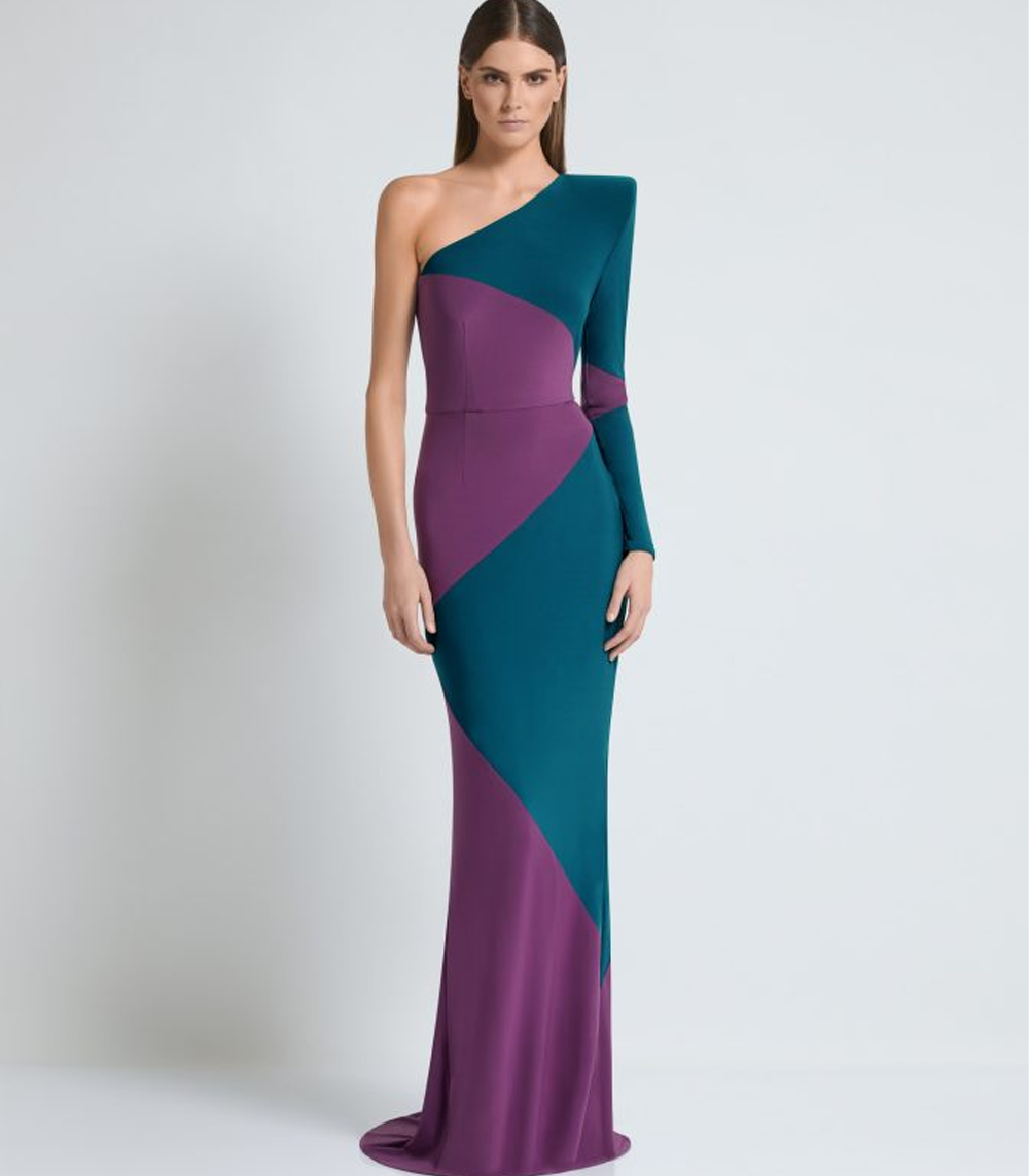 A FULLY LINED ONE SLEEVE JERSEY MID-LENGTH DRESS WITH CONTRAST PANELS & SHOULDER ACCENTS MODEL IS WEARING SIZE US2/AU6 Model: ZV-1250