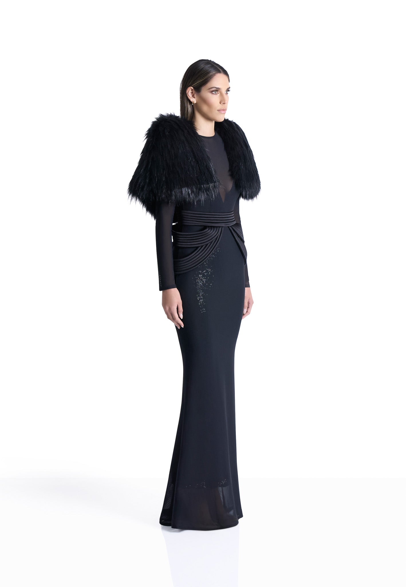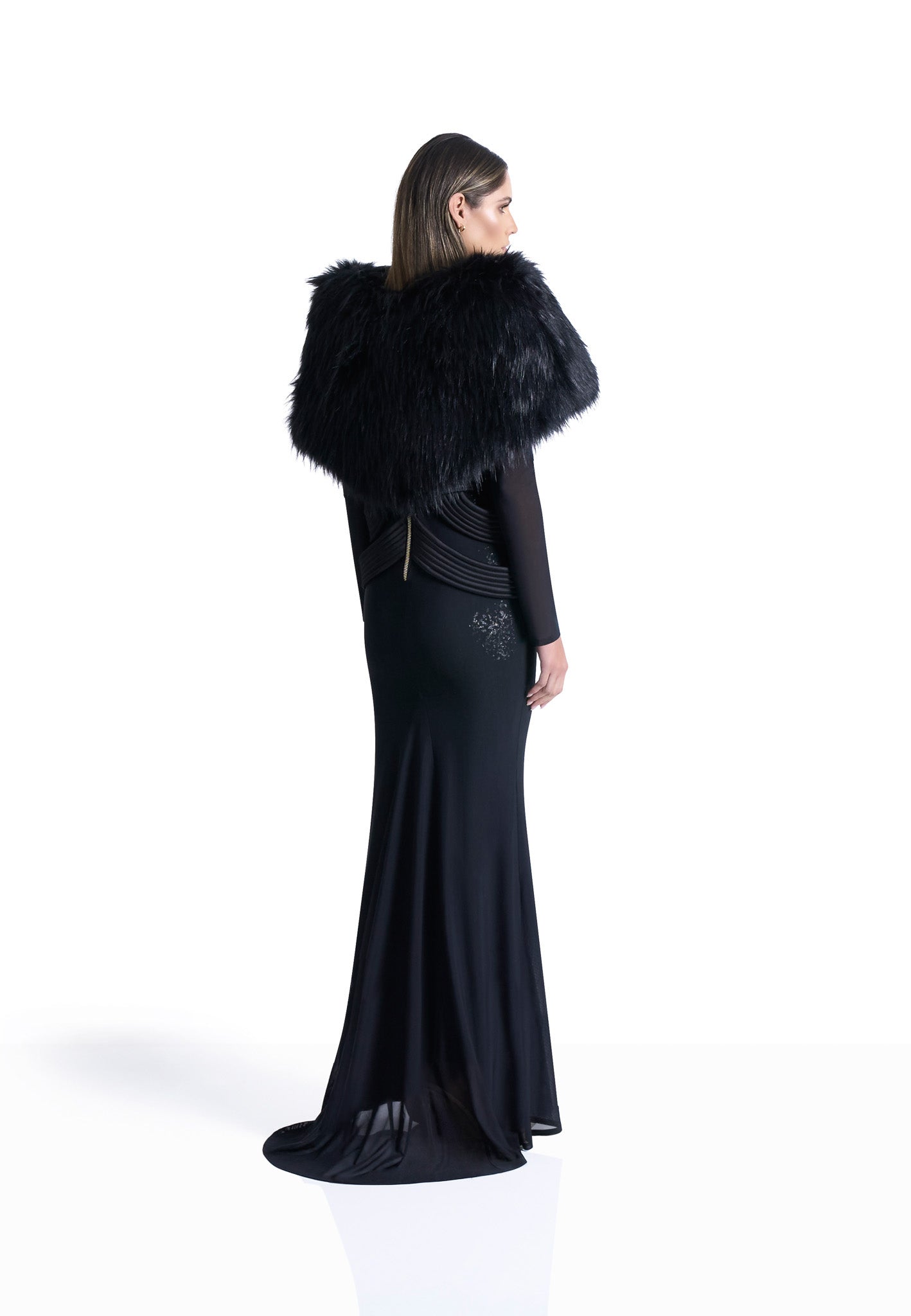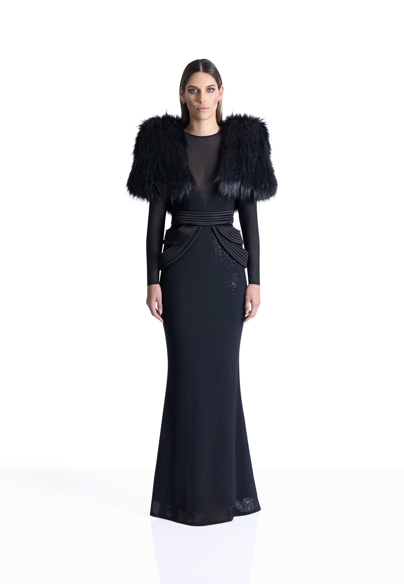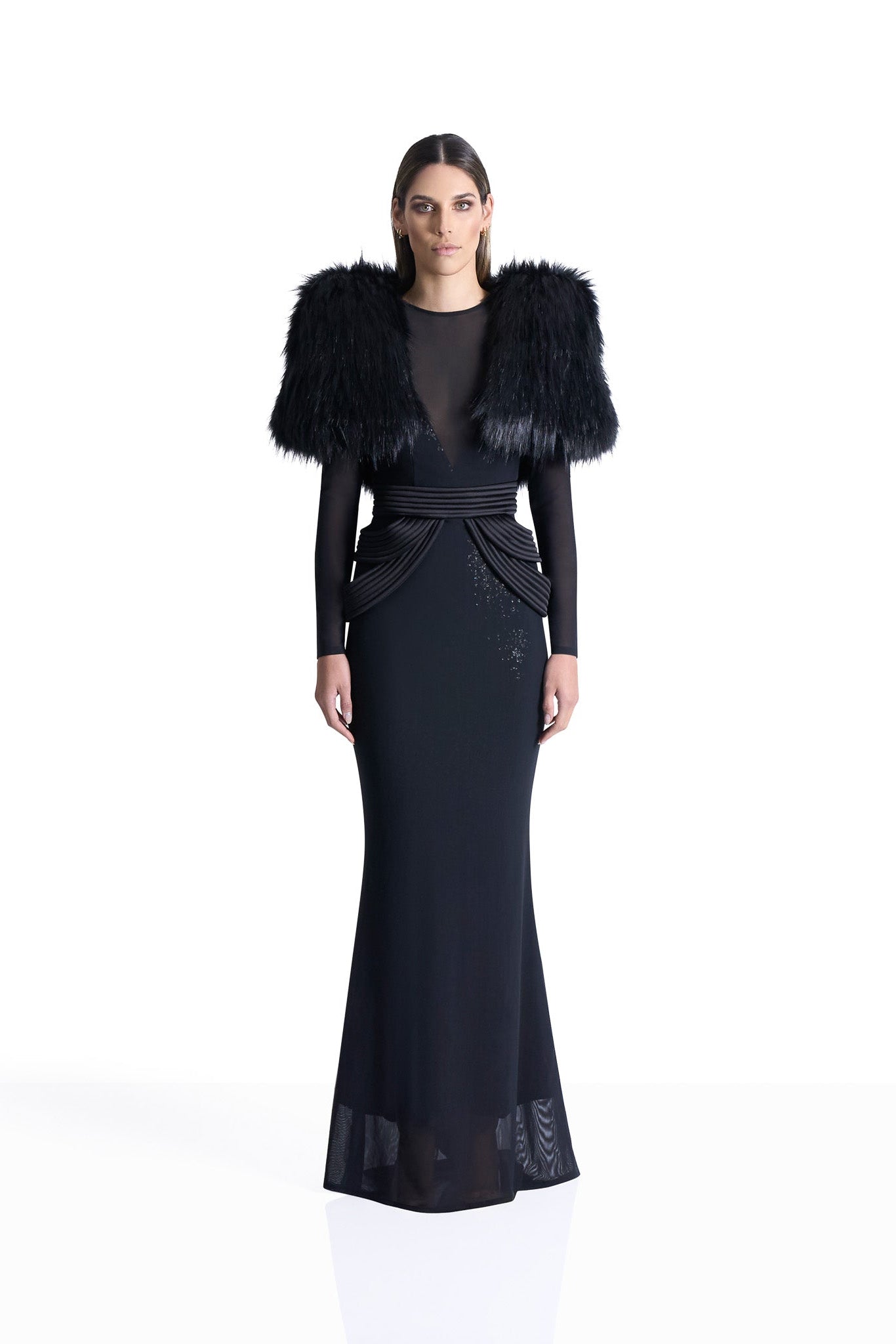 Command attention with the breathtaking Dramatic Allure Gown, a striking fusion of elegance and bold sophistication. This captivating piece features a sleek silhouette that gracefully hugs the body, enhanced by a luxurious feathered cape that adds an extraordinary flair.