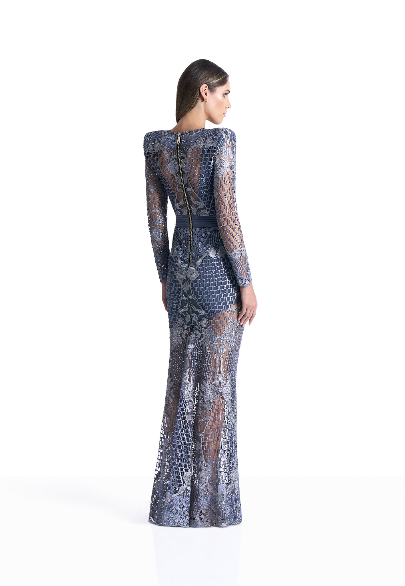A PARTIALLY LINED HONEYCOMB LACE GOWN WITH STITCHED SATIN PANELLING AND SHOULDER ACCENTS