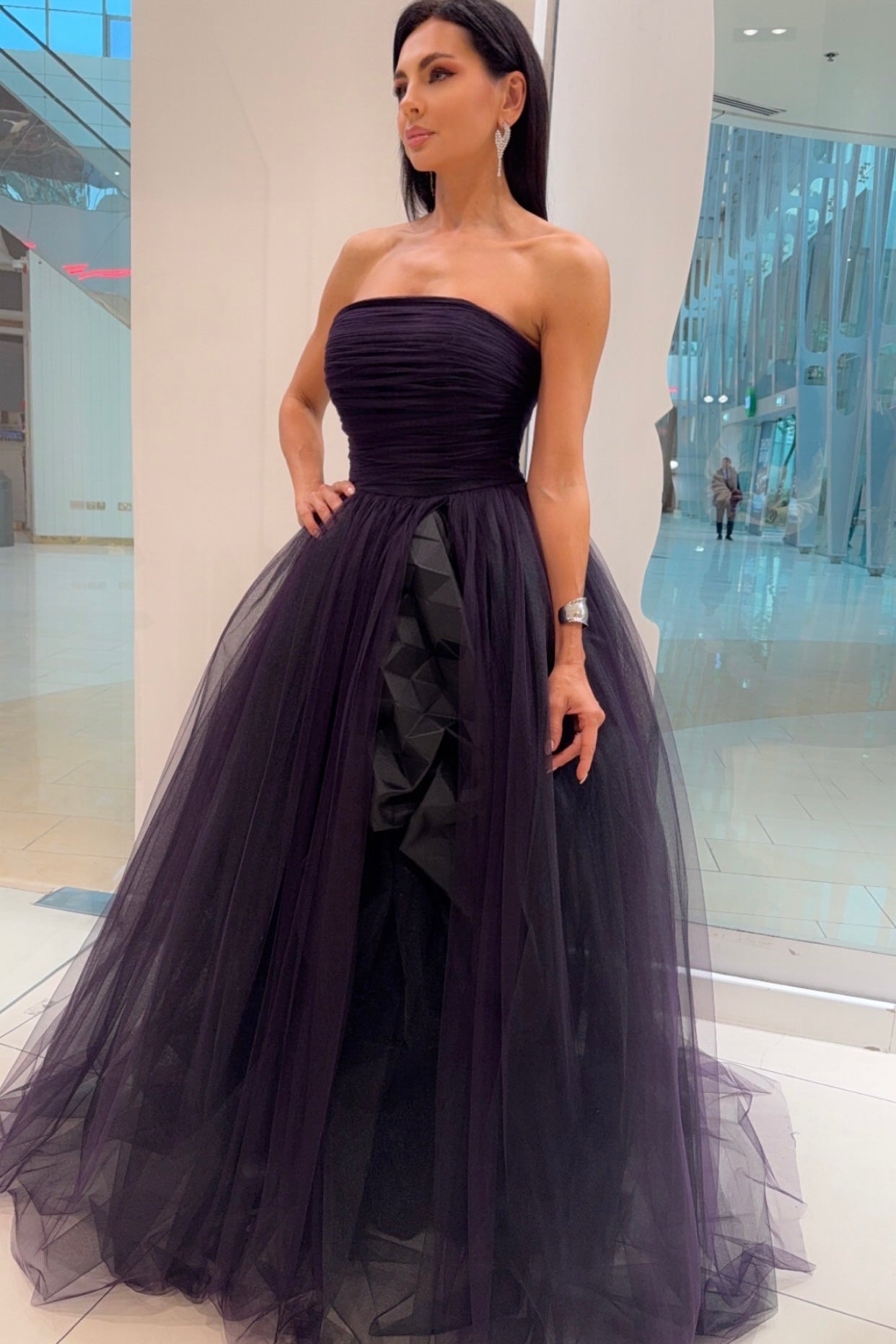 This stunning strapless evening gown features a structured bodice and a voluminous tulle skirt in a captivating blend of deep purple and black, creating a dramatic and elegant silhouette.