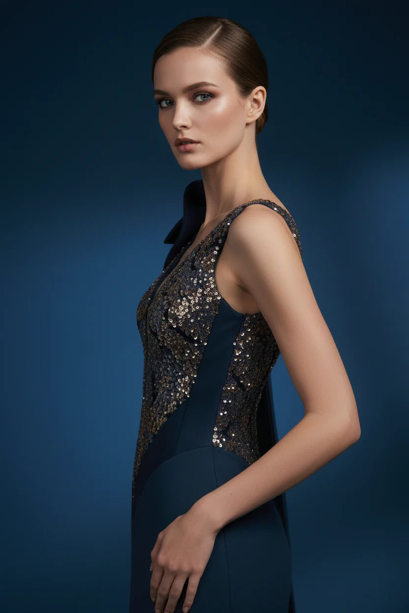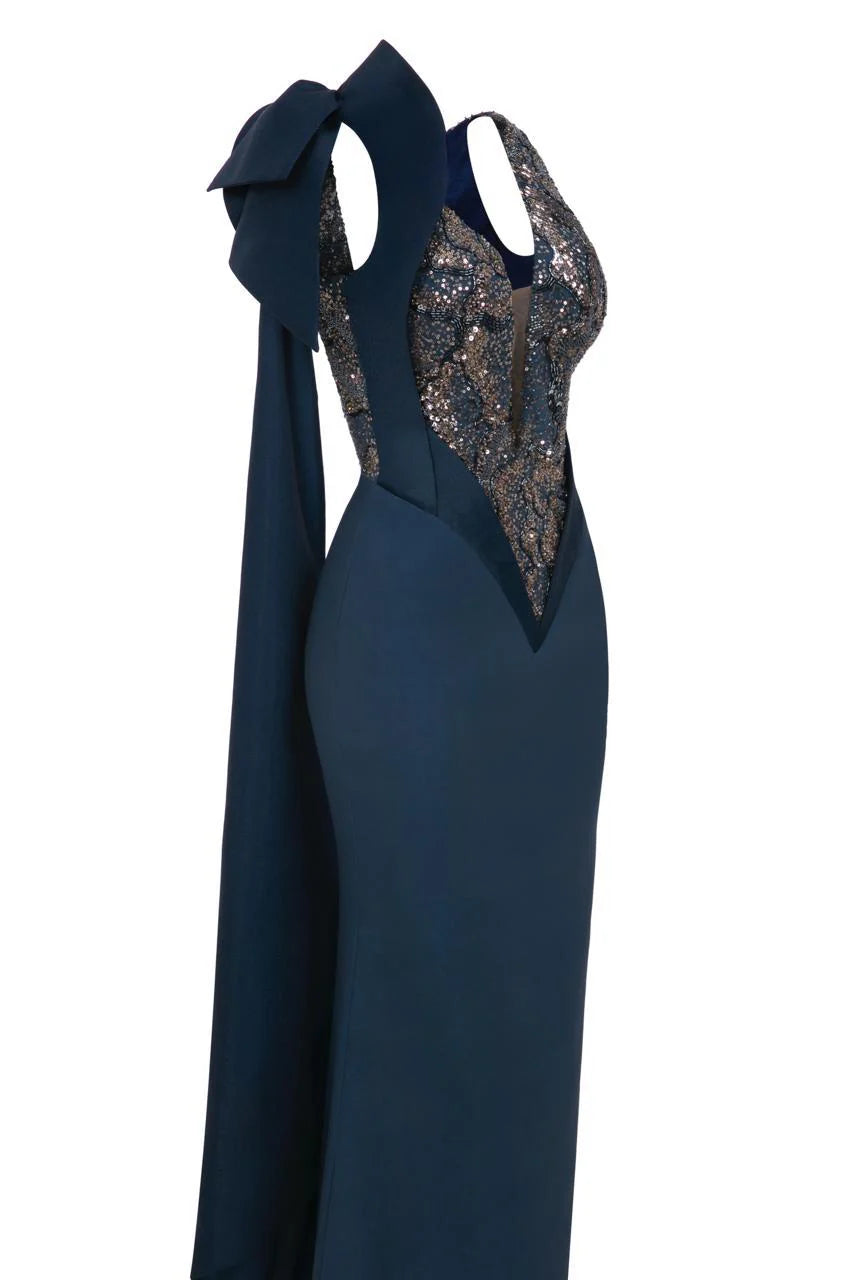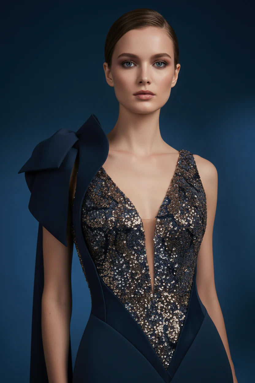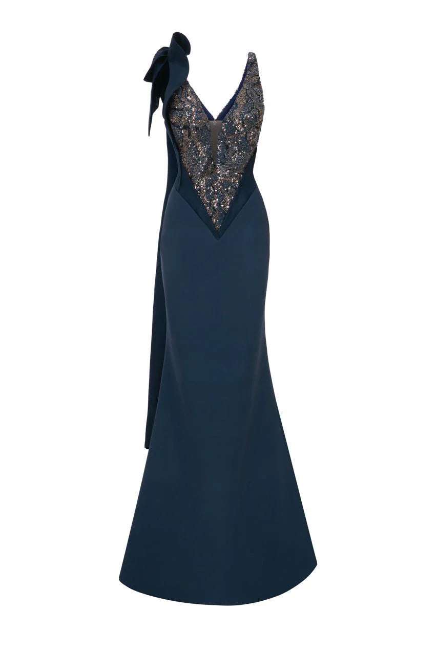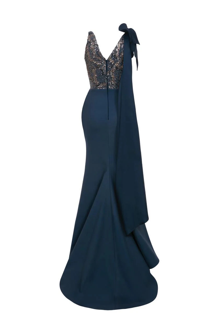 Turn heads at any special occasion in this sophisticated navy evening gown. The fitted mermaid silhouette is cut from smooth crepe for a sculpted look, while the plunging V-neckline shimmers with hand-sewn sequins in a tonal bronze-gold mix. A dramatic oversized bow at the shoulder drapes into a long flowing sash, adding movement and couture flair.