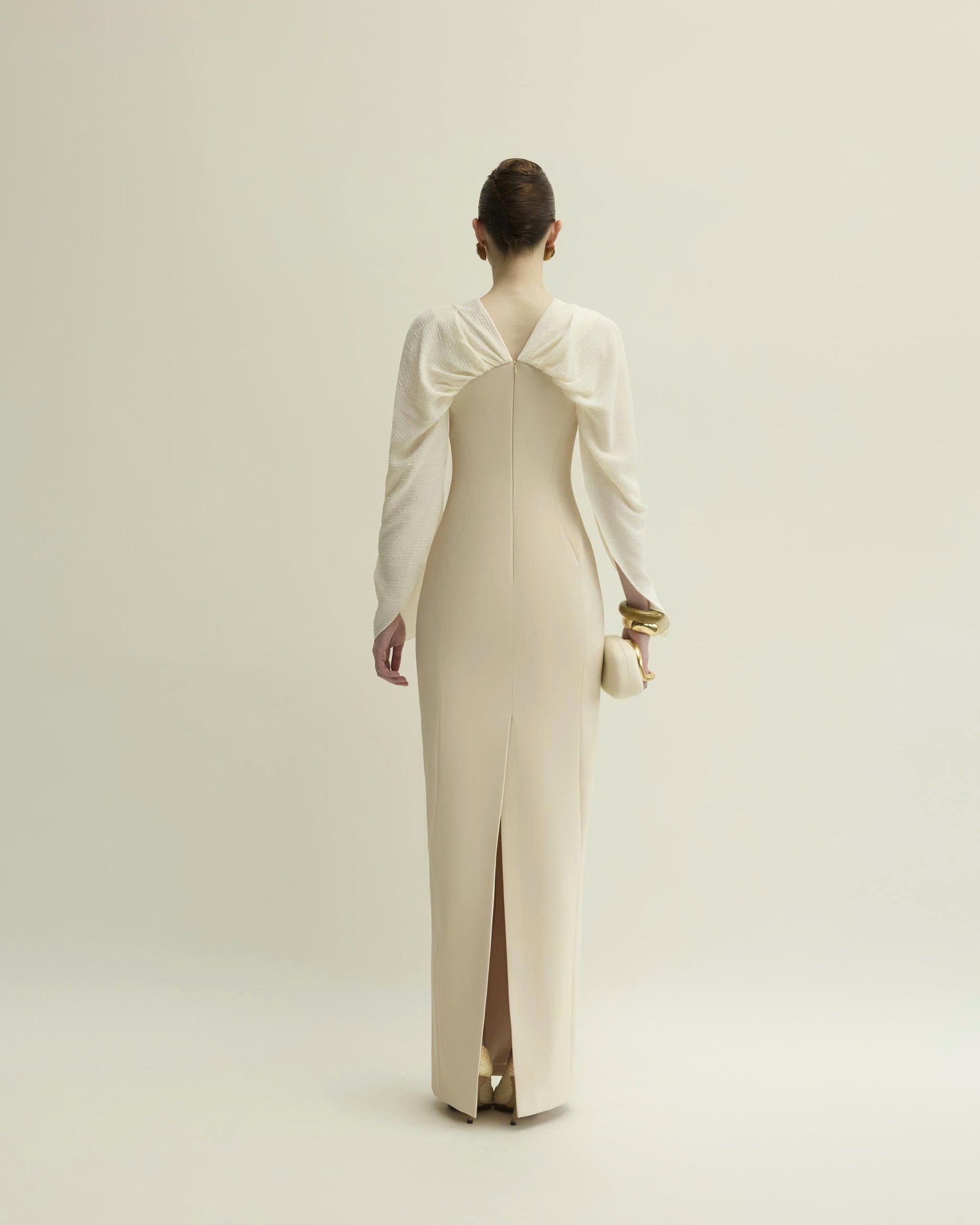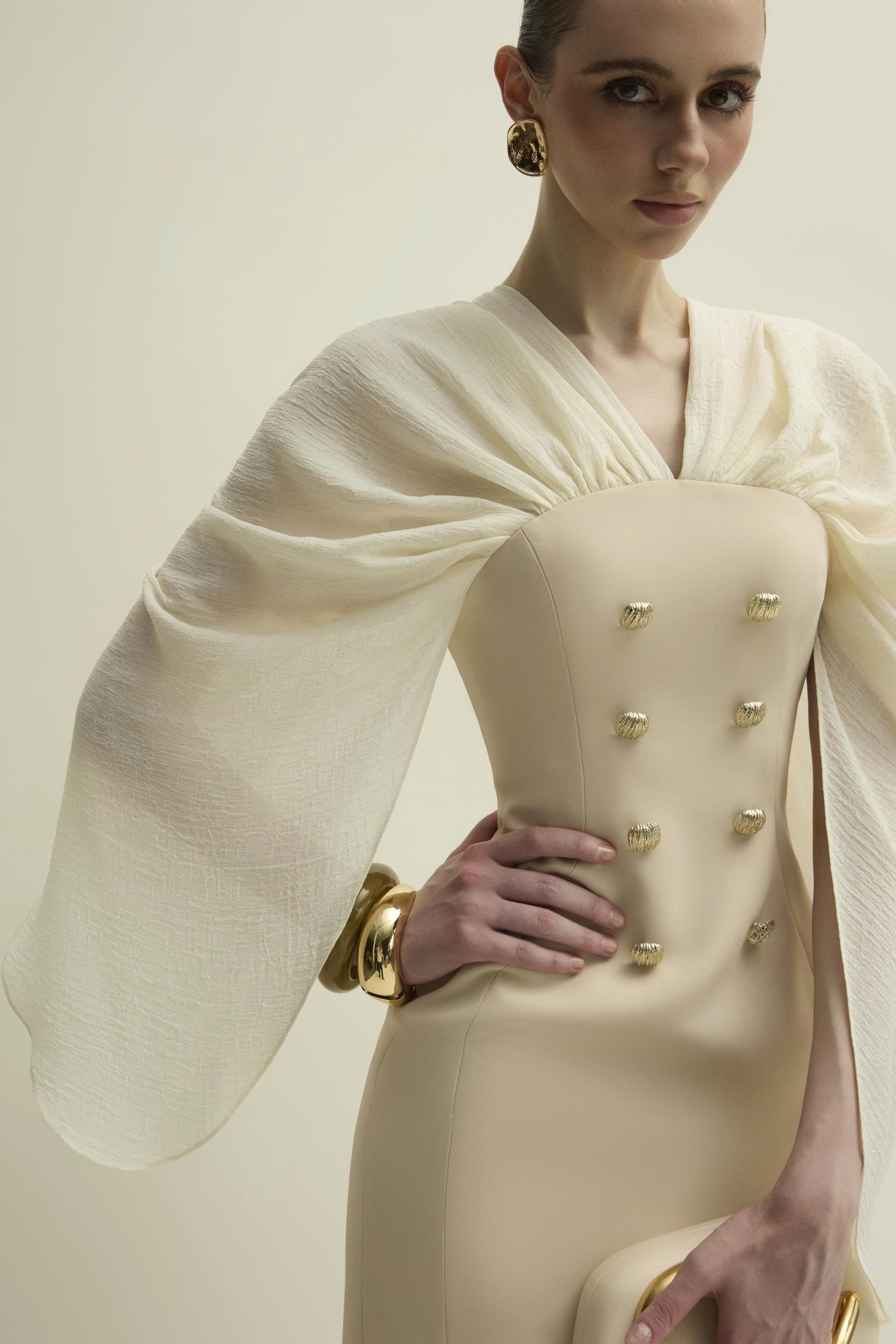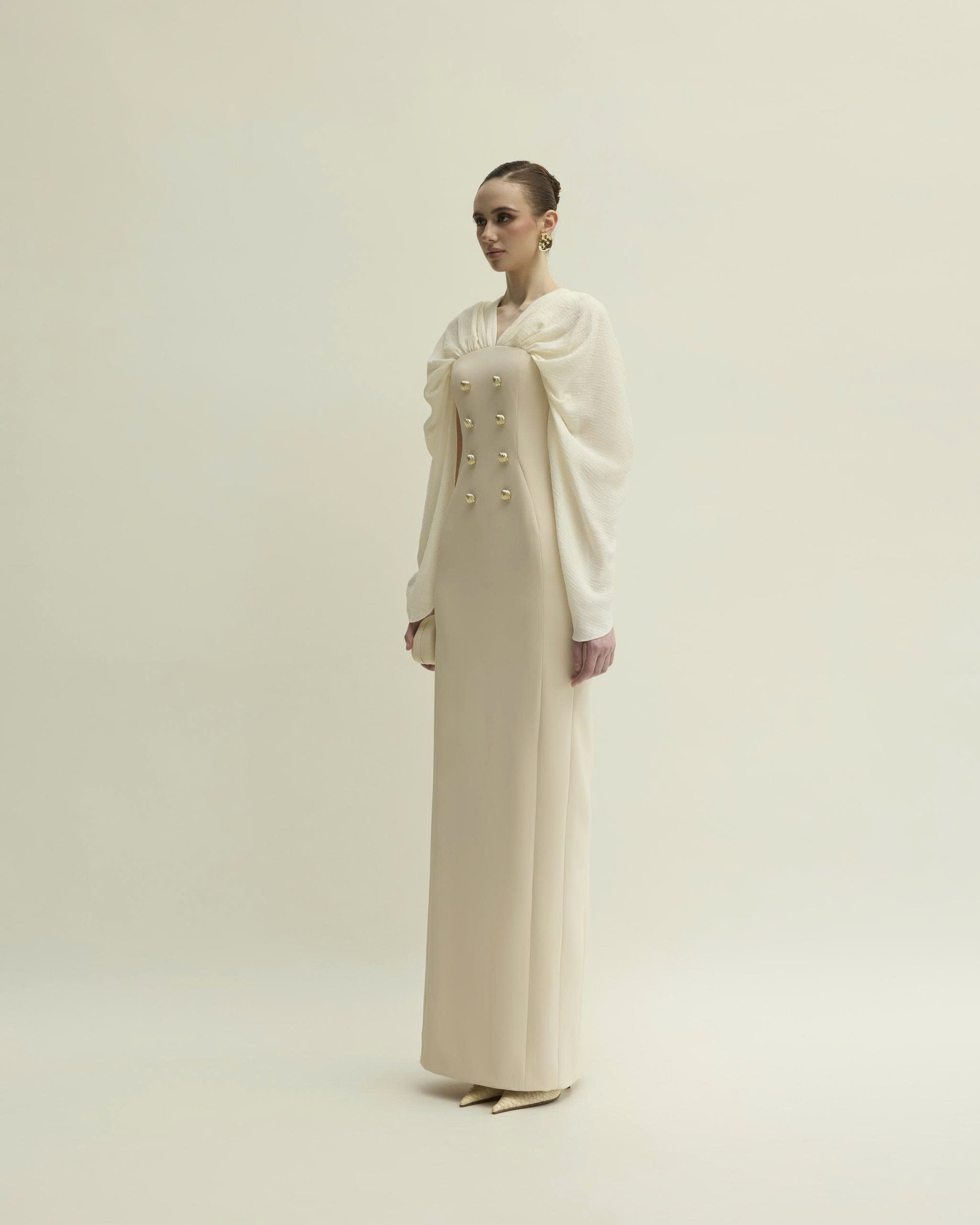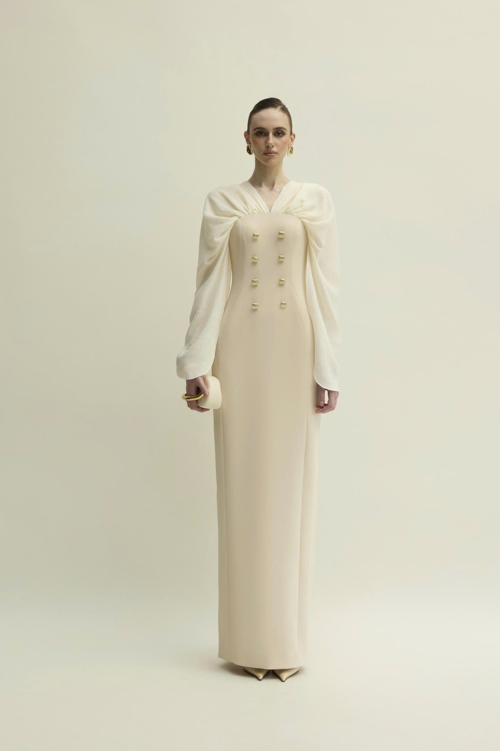 This refined ivory gown embodies timeless elegance with its floor-length silhouette and clean, structured design. The dress features a straight column cut, accented by delicate button detailing along the bodice, adding a touch of sophistication. Soft, draped sleeves fall gracefully from the shoulders, creating a romantic yet regal effect. Paired with minimal accessories, this gown is a statement of understated luxury, perfect for formal soirées or high-fashion occasions.