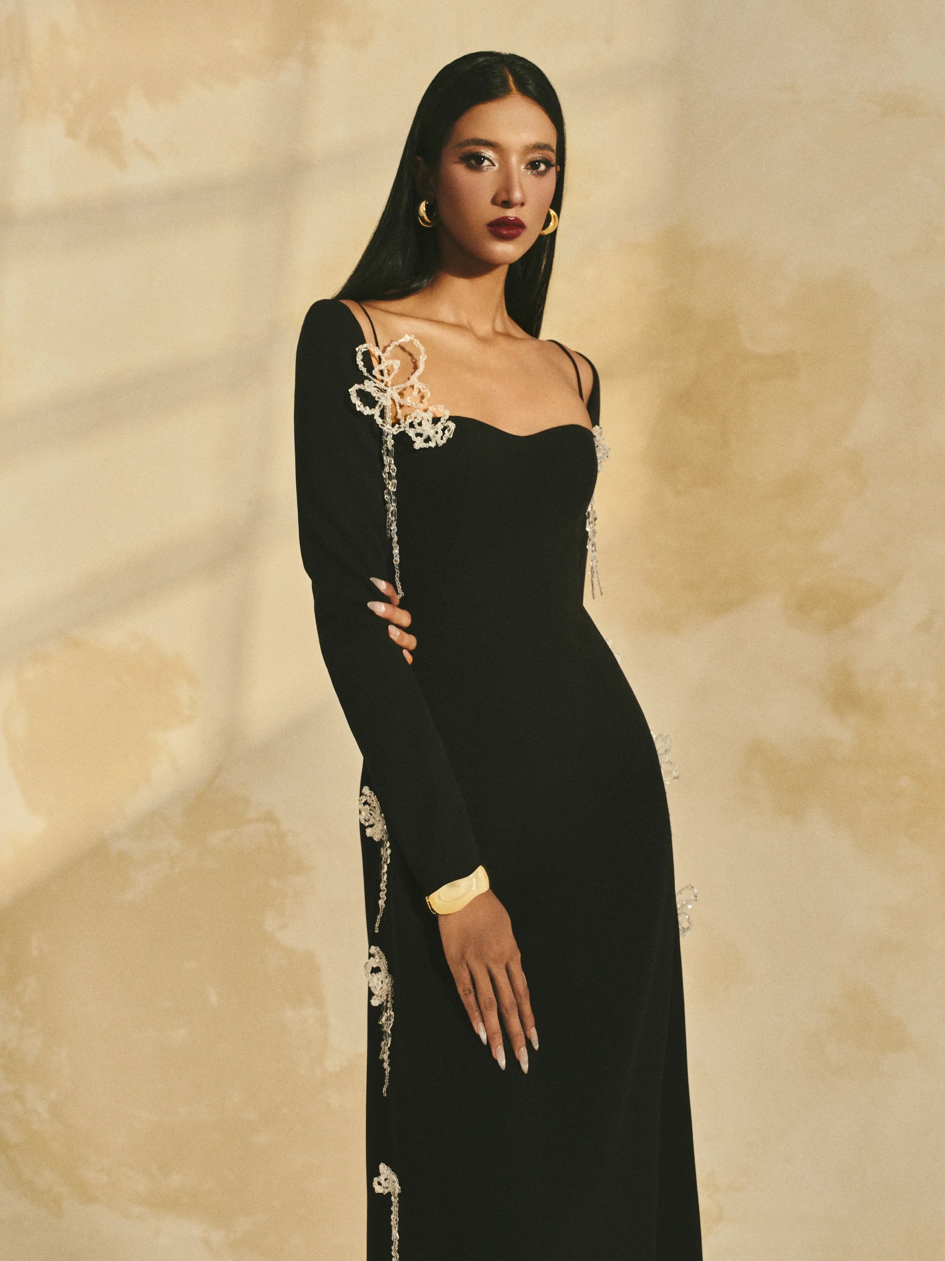 Long-sleeve maxi dress crafted from poly crepe, featuring a softly contoured neckline paired with uniquely designed shoulder straps. Crystal beading traces the bodice and neckline, beautifully complemented by handcrafted 3D crystal floral details