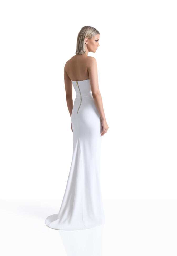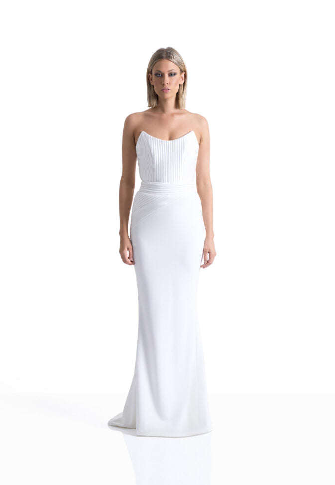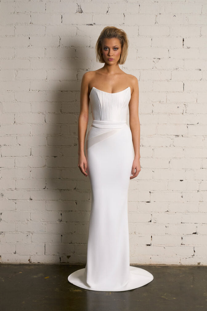 A STRAPLESS STRETCH CREPE GOWN WITH STITCHED SATIN PEAKED BODICE & SATIN HIP PANELLING.