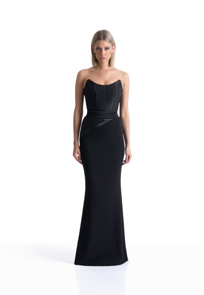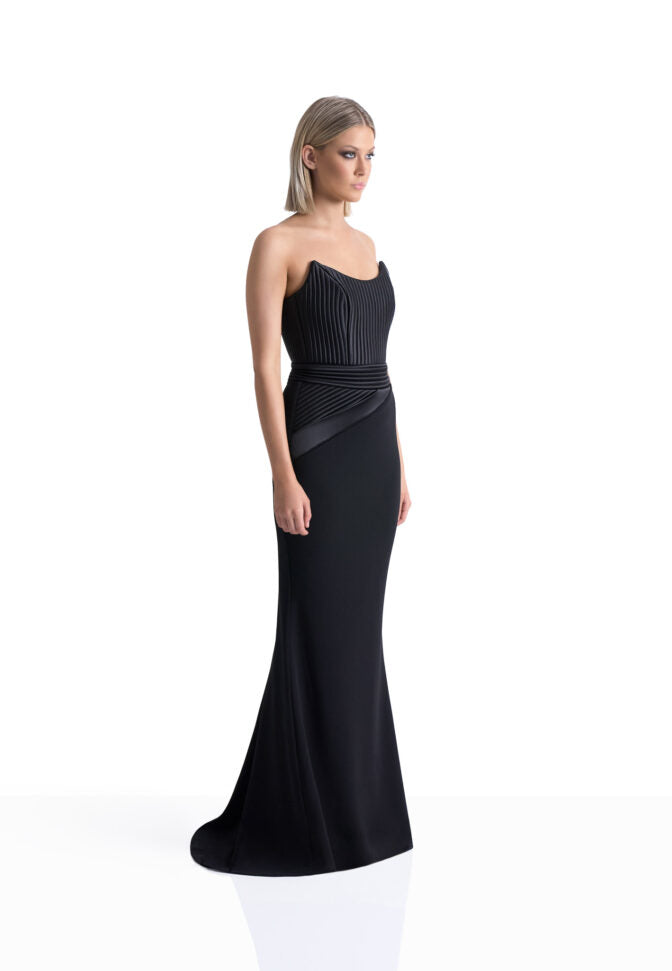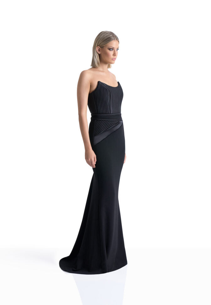 A STRAPLESS STRETCH CREPE GOWN WITH STITCHED SATIN PEAKED BODICE & SATIN HIP PANELLING