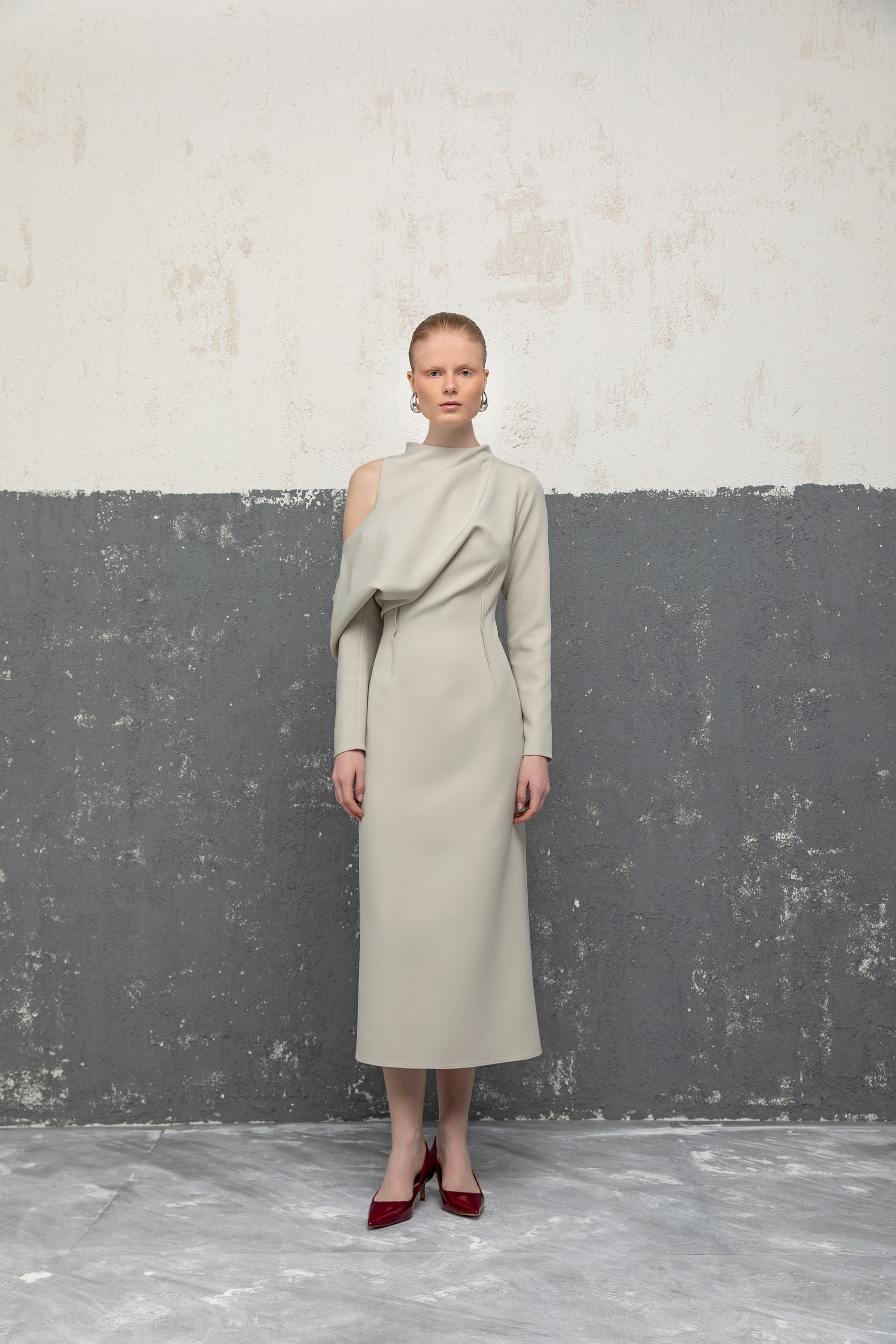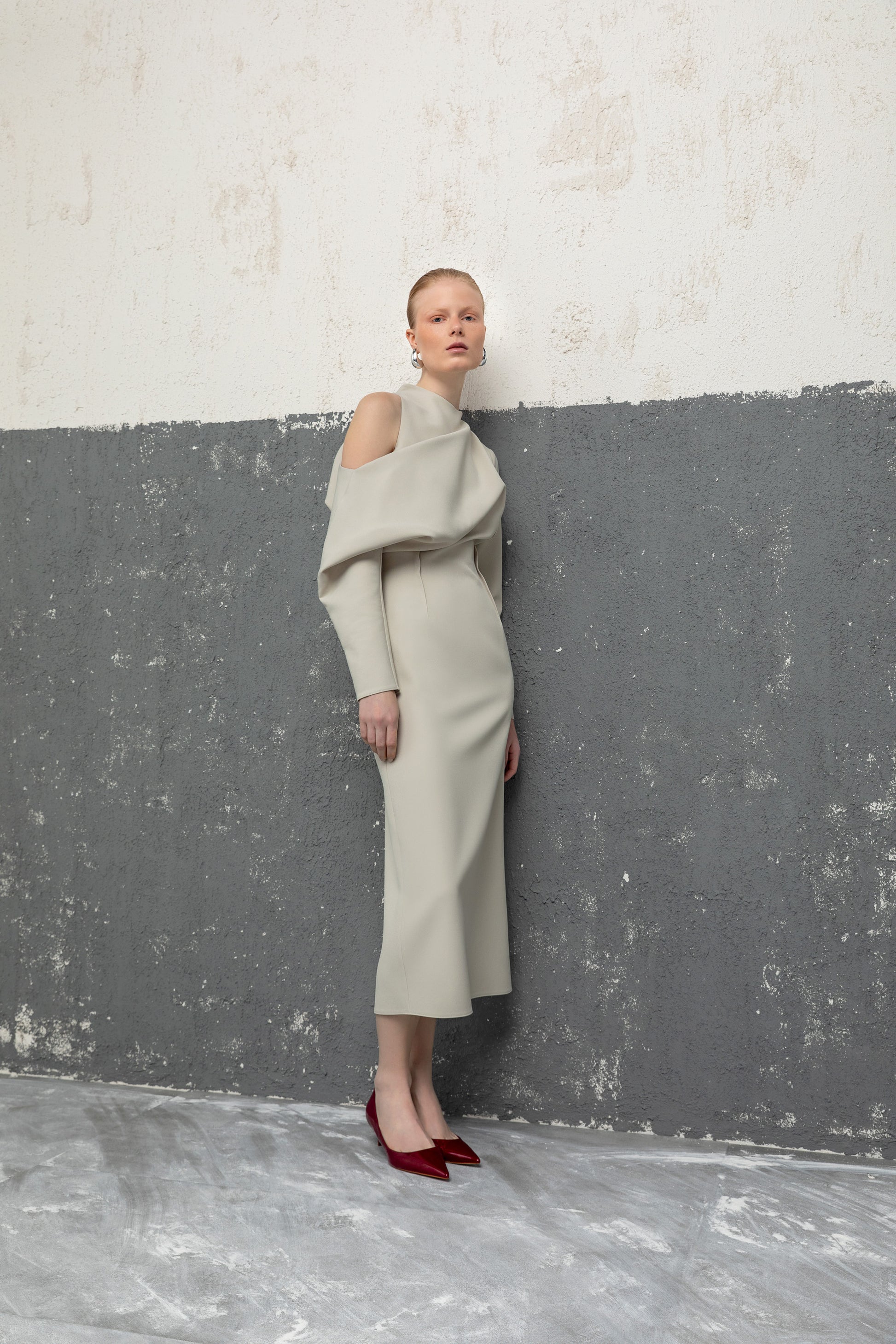 A strikingly modern midi dress designed with a sculpted silhouette and an asymmetrical drape, creating a bold architectural look. The high neckline contrasts with the daring single-shoulder cut-out, blending sophistication with an avant-garde twist. Tailored to perfection, the dress offers a clean, minimal finish, ideal for refined evenings or contemporary formal events.