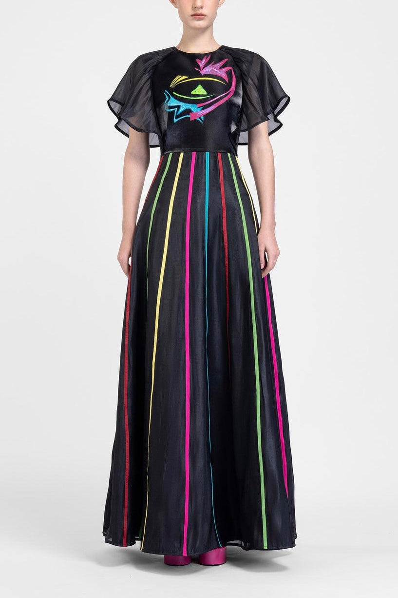 Experience elegance and sophistication with this stunning black evening dress. Crafted from luxurious Zibeline and organza fabric, the dress features soft butterfly sleeves and a unique hand-painted abstract pattern. With 17 pieces of organza fabric connected by colorful vertical lines at the bottom, creating a brilliant and eye-catching look, this dress is a true adventure in fashion.