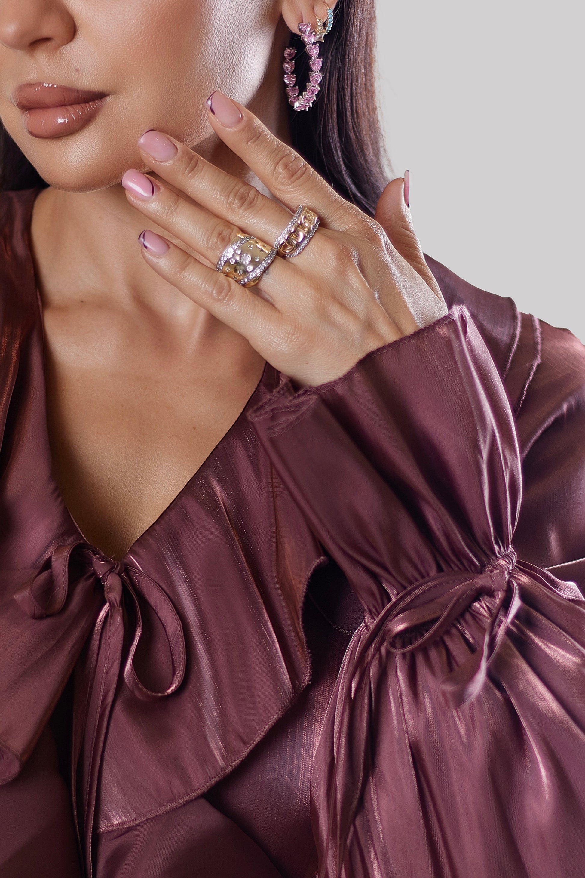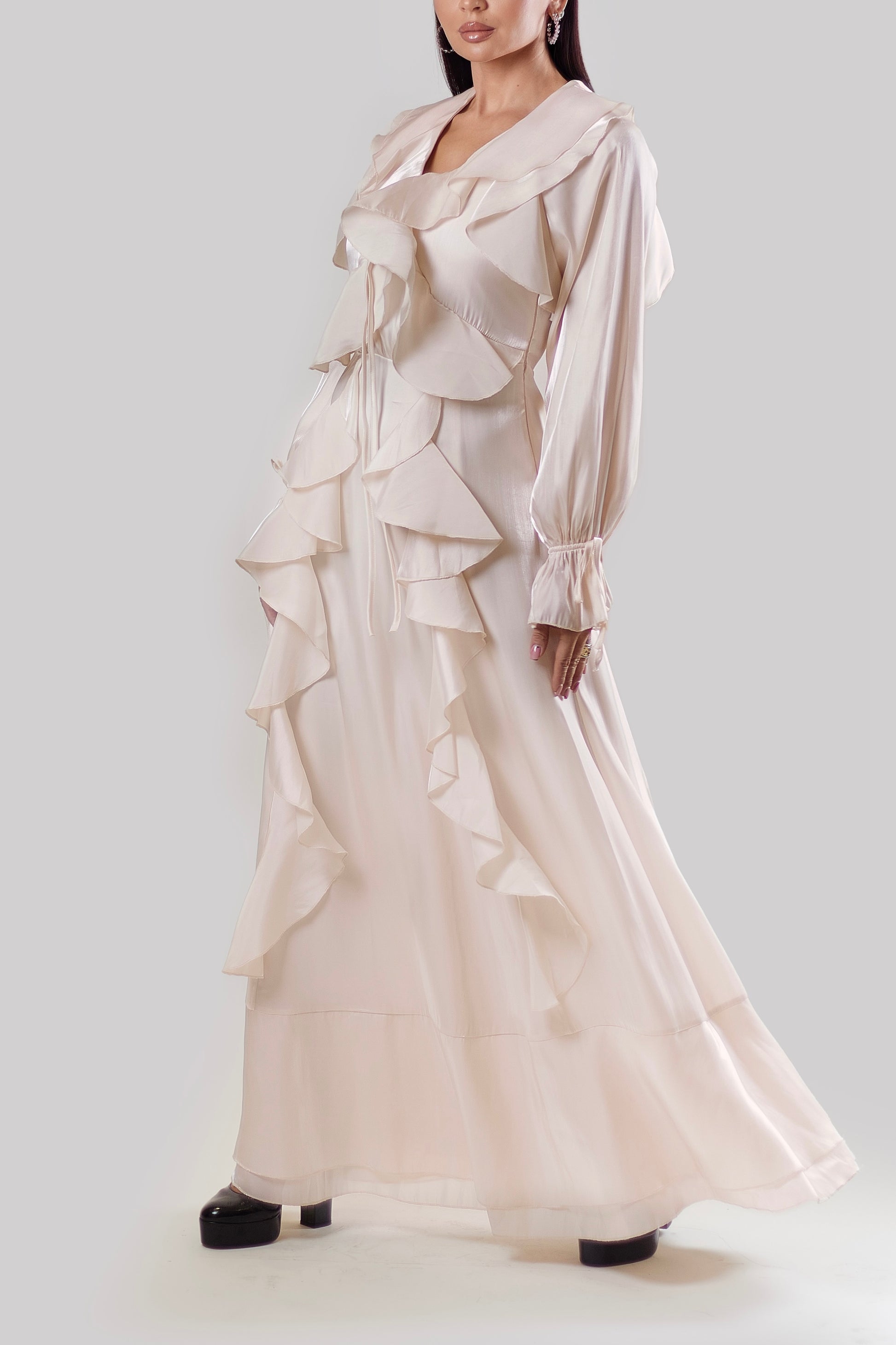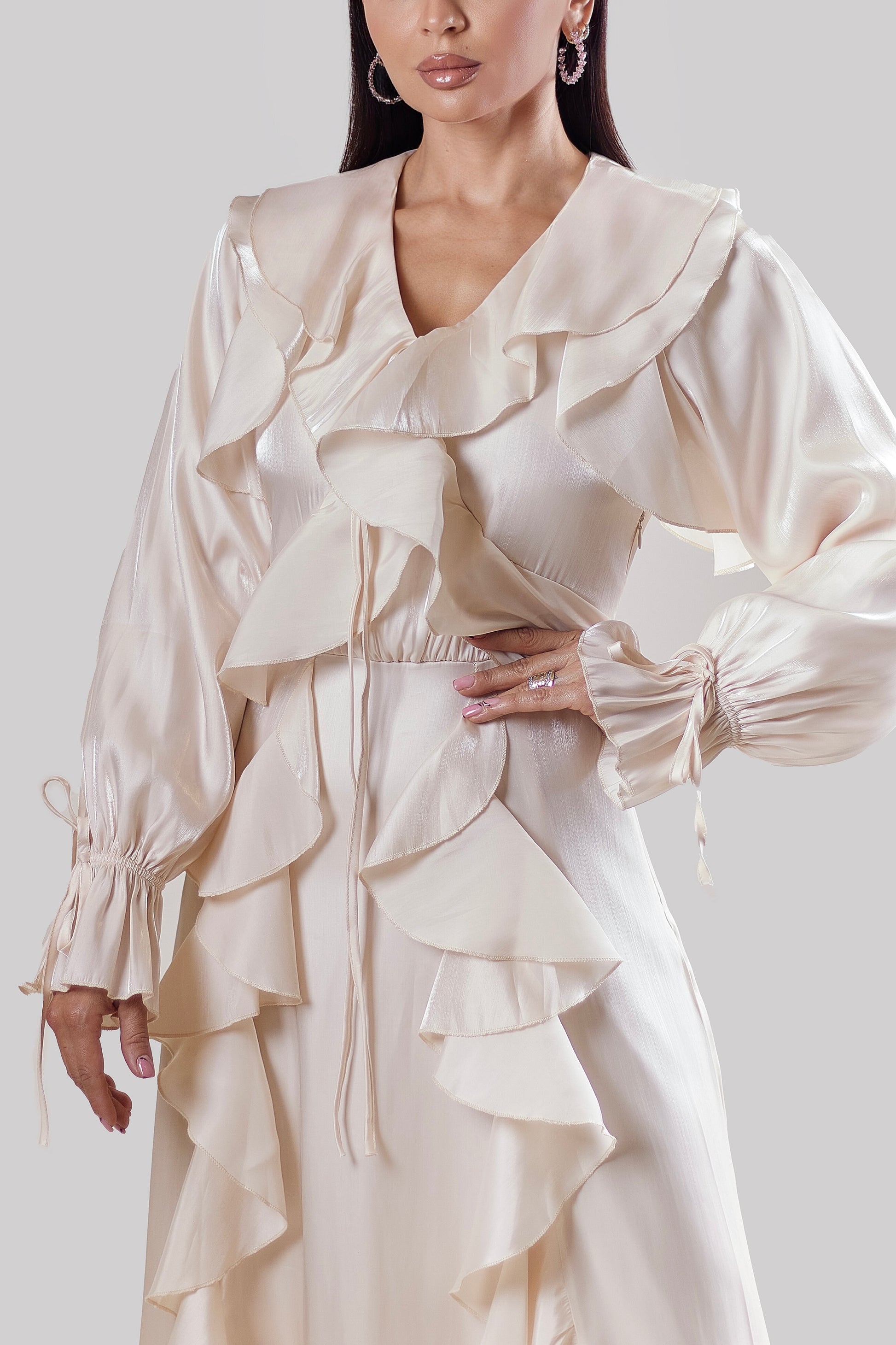 A flowing satin dress designed with cascading ruffles and a tie-neck detail that exudes timeless femininity. The cinched sleeves add a touch of romance, making it perfect for elegant evenings or refined daytime occasions.
