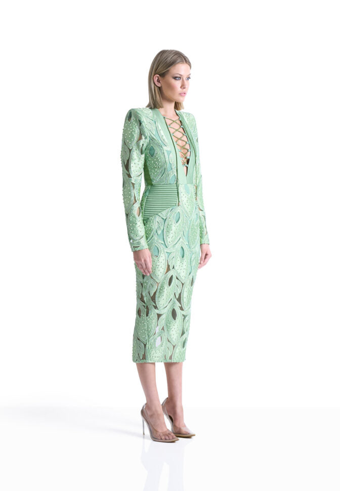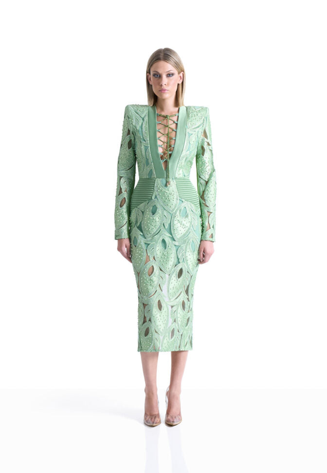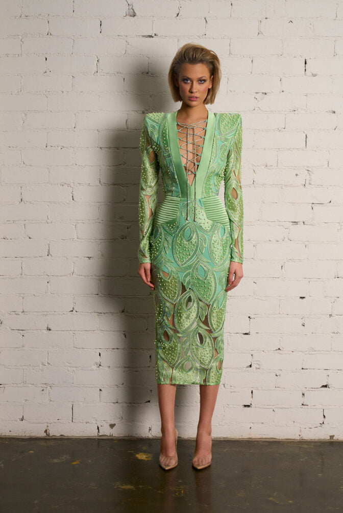 A PARTIALLY LINED LACE DRESS WITH LACE UP FEATURES WITH STONE TIES, STITCHED SATIN PANELLING, ASYMETRICAL SKIRT LINING AND SHOULDER ACCENTS.