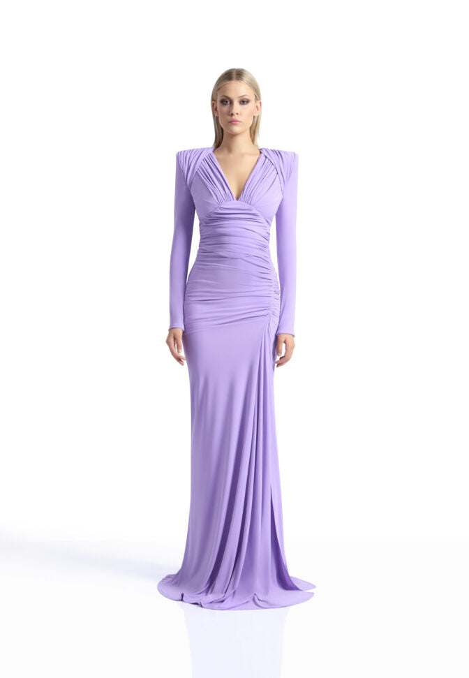 A LONG SLEEVE STRETCH JERSEY GOWN WITH GATHERED BODICE, WAIST AND SHOULDER PANELS WITH FRONT SPLIT AND SHOULDER ACCENTS